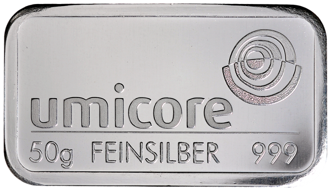 Lingot de 50 g d’argent fin, marque "Umicore" (fabrication suisse d’excellente qualité, état neuf, scellé dans sa pochette plastique d’origine).