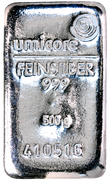 Lingot de 500 g d’argent fin, marque "Umicore" ou "Argor Heraeus" (fabrication suisse d’excellente qualité, état neuf, scellé dans sa pochette plastique d’origine).
